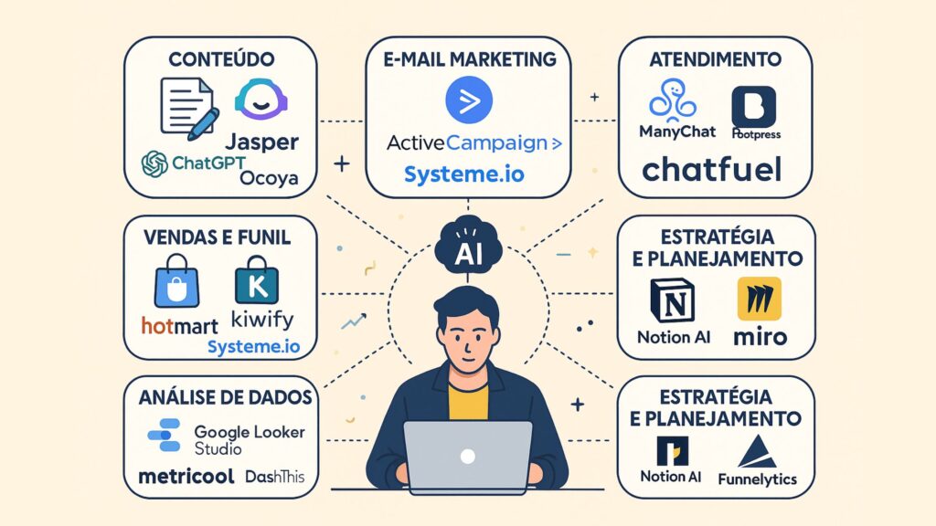 - As ferramentas de IA e automação mais eficientes para diferentes áreas (marketing, vendas, atendimento, conteúdo, etc.);